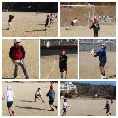 ラグビーボールを使った運動に取り組みました。3人一組で動きながら投げ合い、仲間の動きを予測してパスを出していました。相手の位置や動く速さを考えながら声をかけ合い、協力して活動する姿が見られました。運動を通して、考えて動く力や仲間と連携する大切さを学んでいました。
