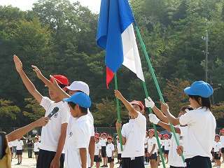 左の画像は「児童会会長のことば」、そして右の画像は「選手宣誓」の様子です。
