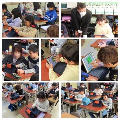 ICT支援員さんと一緒に「プログラミング学習」に取り組みました。画面上のキャラクターを思い通りに動かすため、子どもたちは「右に3歩」「ここで回る」など、試行錯誤の連続です。論理的に考える力だけでなく、友達と教え合う姿も見られ、デジタルの世界に親しむ時間となりました。