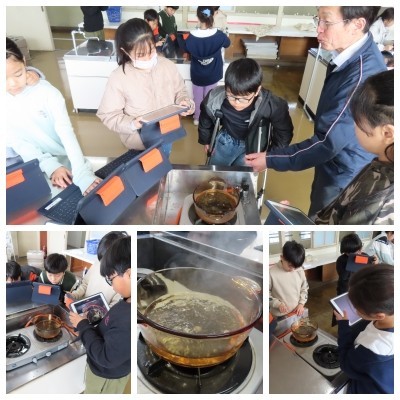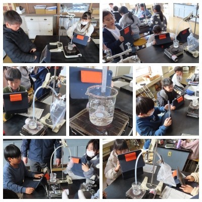 沸騰石を入れ、ブクブクと激しく出てくる「あわ」をじっと見つめる子どもたち。「このあわの正体は何だろう?」と、袋を使ってあわを捕まえ観察し、その正体が「水蒸気」であることを確認していました。目に見えない変化を科学的な視点で捉えようとする、キラキラした瞳が印象的な授業となりました。