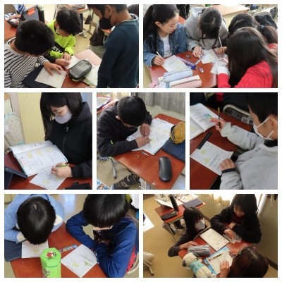 友達と自分の考えを出し合いながら学びを進めていました。分からないところを質問したり、自分の考えを説明したりすることで、お互いの理解を深め合います。学び合う姿の中に、力を高め合う子どもたちの成長が感じられました。 -