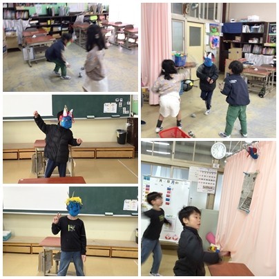 緑組で豆まき会を行いました。子ども達は、自分の中にある「なおしたいところ、気をつけたいところ」を鬼にみたてて、一人ひとりオリジナルの鬼のお面を作りました。「動画見すぎ鬼」「お菓子食べ過ぎ鬼」などの鬼のお面が完成しました。 みんなで力を合わせて、新聞紙の豆で鬼を追い払いました。楽しみながらも、自分を振り返る時間となりました。
