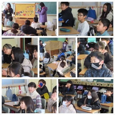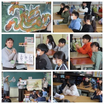 「やまたのおろち」の読み聞かせが行われました。「古事記」の名場面が、迫力満点の語りと手作りの小道具で再現され、子どもたちは釘付け。「三種の神器」についての紹介を熱心に聞き入っていました。日本の文化に触れる貴重な学びの時間をありがとうございました。
