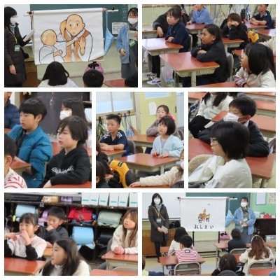なんじゃもんじゃの皆さんによる『せかいいちのはなし』の読み聞かせが行われました。物語に登場する方言の温かな語り口に引き込まれ、言葉の魅力に触れるひとときとなりました。読み聞かせ後には、色塗りの工夫や方法も丁寧に教えていただきました。子どもたちが今後の図工作品にどのように生かしていくのか、とても楽しみです。なんじゃもんじゃの皆さん、ありがとうございました。