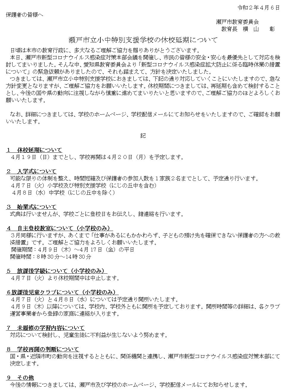 瀬戸市立小中特別支援学校の休校延期について  ← こちらをクリックしてください
