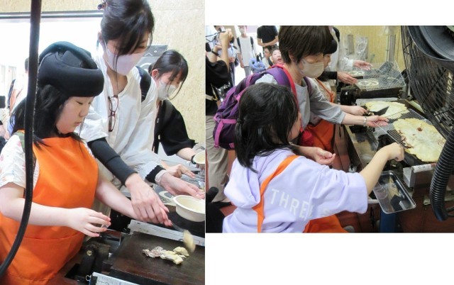えびせんパークでは、「ぺったん体験」でせんべい作りにチャレンジ!授業で練習したことを思い出しながら上手に作ることができました。焼きたてのせんべいは大きくて温かくて、見た目にもびっくり!