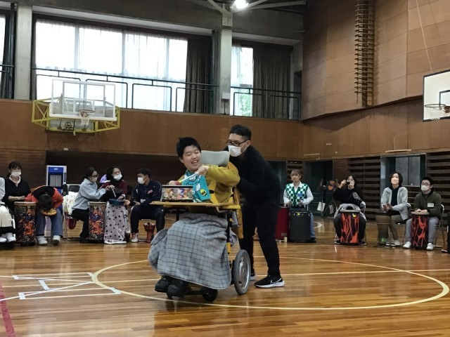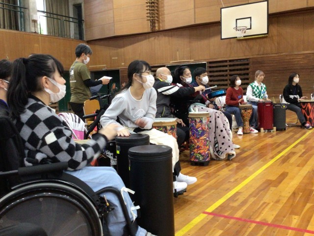 MARUWAの音楽会では、会場にいるみんなで輪になり、曲に合わせて鈴を鳴らしたり、太鼓を叩いたりしました。