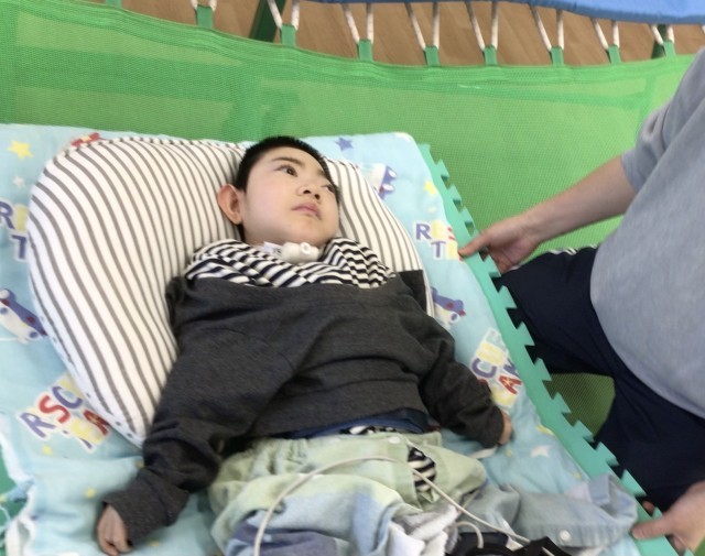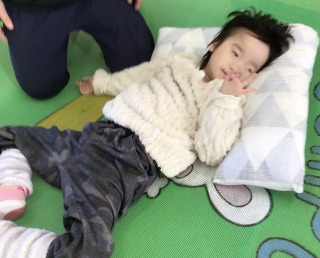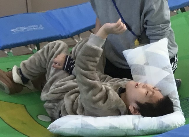 3年2・3組は、2時限の体育で寝返りや高ばいなどでトランポリンに移動し、音楽にあわせて弾んだり揺れを楽しんだりしました。