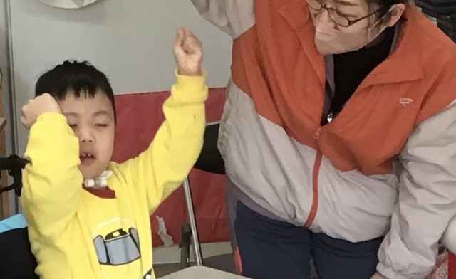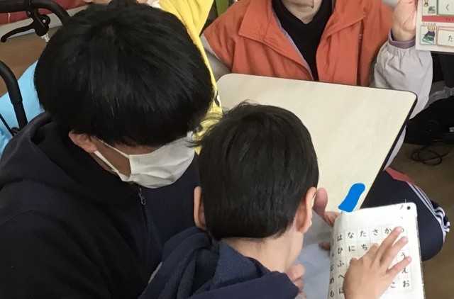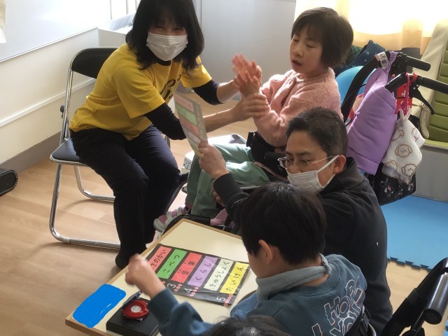 1年2組と2年1組は、1時限に朝の会を行いました。時間割調べでは、カスタネットをたたいて何時間目かを数えたり、授業の名前を文字盤で伝えたりしました。