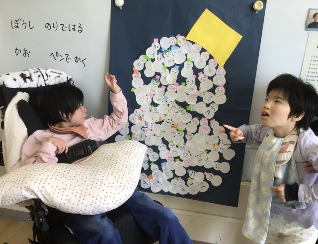 6年1・2組は、帽子をのりで貼ったり、顔をペンで描いたりして一か月位かけてミニ雪だるまを100個近く作りました。それを5時限のたいけんで合体させて特大雪だるまを完成させました。見ごたえのある作品ができました。