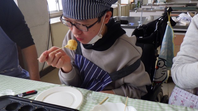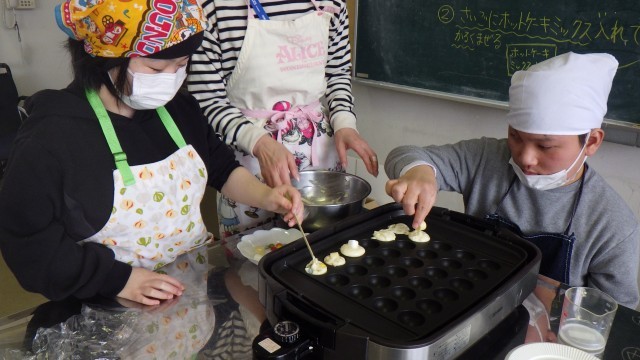 中学部1・2・3年1組 調理実習 公開日 2026/03/04 更新日 2026/03/04 学校日記 3月3日(火)の「お楽しみ調理実習」では、ホットケーキミックスを使ってベビーカステラを作りました。中にはマーブルチョコレート、マシュマロ、ジャム、キャンディチーズなどを入れました。竹串を使って上手にくるくると丸め、おいしそうなベビーカステラを作ることができました。職員室にいる先生にもおすそ分けしましたよ。 いいね(1)