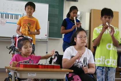 6月29日(水)に小学部6年生が萩山小学校6年生と交流及び共同学習を行いました。音楽室で互いに音楽の合奏や合唱を発表した後、合同で「ラバーズコンチェルト」を練習し、班ごとに発表しました。リコーダーやサウンドブロック、ハンドベル、打楽器などの楽器の響きやリズムが重なり、どの班の演奏も素敵でした。