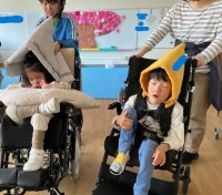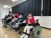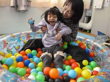 教室を暗くして、光遊びを行いました。キラキラと輝くカラフルな光を目で追う様子が見られ、視覚からの刺激をたくさん感じることのできる活動となりました。ボールプールでは、ごろごろとしたボールの感覚を全身で感じました。初めは不思議そうな表情をしていましたが、慣れてくると声を出して笑ったりボールを握ったりする様子が見られ、全力で楽しむことができました。