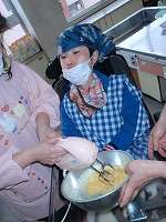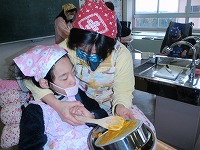 中学部1年3組、2年1組、3年2組では、自立活動(たいけん)の時間に調理実習をしました。ポタージュスープとマドレーヌを作りました。家庭室の中によい香りが漂い始めるとみんなにっこり。できあがった料理をおいしくいただきました。