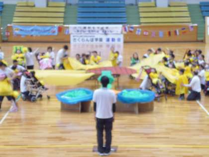 赤白に分かれて玉入れをしたり、小学部と中学部・高等部の児童生徒がペアを組んでリレーをしたりと、白熱した一日となりました。ボランティアとして光陵中学校の生徒にも参加していただき、みんなの笑顔があふれる運動会となりました。