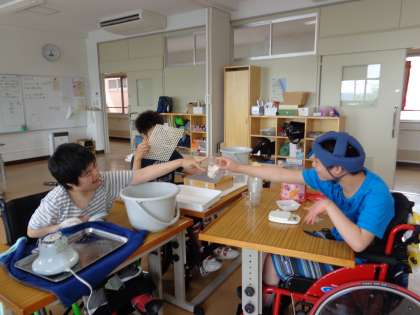 作業学習で、牛乳パックを利用した紙すきに取り組んでいます。一学期は自分が好きなことや得意なことを生かした作業を見つけて自分から取り組めるように、作業内容を工夫したり、友達同士で言葉がけをしたり協力したりする場面を設定しました。できた製品を次の担当に渡すときに「お願いします」と言葉をかけたり、失敗しながらもきれいな紙をすこうという態度が見られたりしました。また、作業日誌も毎回書いて自分の作業を振り返ることで、集中して取り組めるようになってきました。