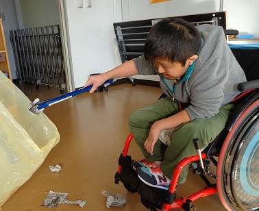 11月21日(火)実施の小中特支ユートピアプランに向けて、自己紹介やごみばさみを使ってごみを拾う練習をしました。まず、教室で新聞紙を落ち葉に見立てて練習です。ごみばさみでつまみたい新聞紙と自分の位置関係を考え、どのようにすればつかみやすいかを話し合いながら決めました。やり方を決めてから3分でどのぐらい拾えるか(つかめるか)をトライしてみました。みんな意欲的にしかも器用にごみばさみを使いこなせるようになりました。