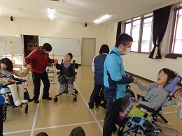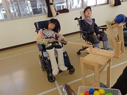 保健体育の授業では、的当てゲームに取り組んでいます。音楽に合わせて準備体操をした後、ゲーム開始です。教師の手作りしたボール発射装置にボールを置いて、スタンバイ完了です。「よ〜く、ねらって!」の声に合わせて、自分の力でひもを引っ張ります。ボールは的に命中し「すご〜い!」と褒められて、みん笑顔になります。チームで協力して勝利を目指す、とても楽しいゲームです。