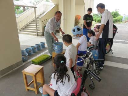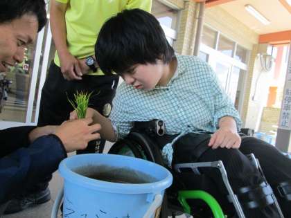 さくらんぼ学園では、今年も瀬戸市で多く作られている「あいちのかおり」をバケツで育てます。自分のバケツに土と水を入れて田起こしをしてから、地元のJAあいち尾東の方に教えていただいて、田植えをしました。農家の人の苦労を感じながら、おいしい米になるように、秋の収穫まで大切に育てましょう。