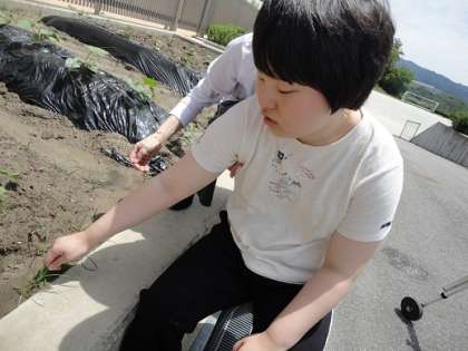 体験の授業で「綿やサツマイモを育てよう」の学習をしています。今年度の遠足、「トヨタ産業記念館」見学のときにいただいた綿の種とサツマイモの苗を植えました。植える前に綿で遊んで感触を味わいながら種を取り出したり、サツマイモの畝にかぶせるマルチで遊んだりすることで、興味をもって活動することができました。植えた後にも、栽培で大切な草取りや水やりを体験しました。11月に収穫するのが楽しみです。