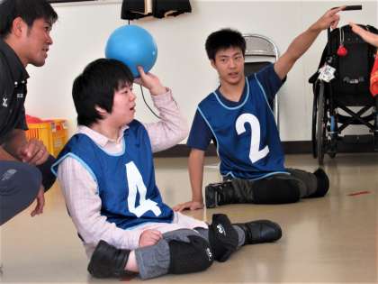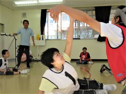 中学部との合同体育で「ゴロハンドボール」の学習をしています。思い切り身体を動かすことの楽しさを味わうことができるように、床に座り、身体に当たっても痛くないやわらかいボールを使っています。片手でしっかりとシュートを打つことができるようになり、パスをするふりをしながらシュートする「フェイント」にも挑戦しているので、これから行われる試合形式の授業での活躍がとても楽しみです。