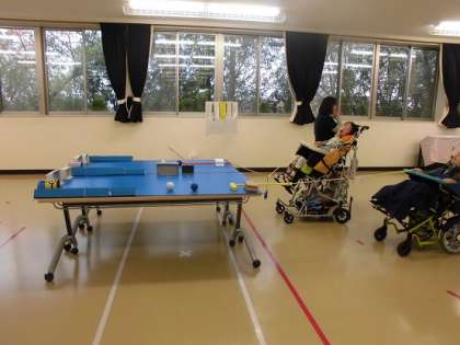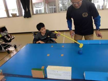 体育の授業で「ビリヤード」の学習をしています。キュー(棒状の用具)の先が大きくなったものや、ひもを引っ張って放すことでボールを突くことができる補助具を使って、自作のビリヤードを楽しんでいます。練習を重ねることで、キューでボールを突くことや、ひもをぐっと引っ張って放す動作がとても上手になってきました。突いたボールが的に入ると大きな歓声が上がり盛り上がっています。2チームに分かれて試合をしていますが、どちらのチームが勝つのか楽しみです。