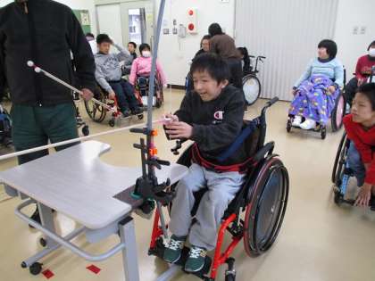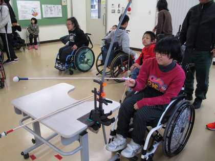 中学部・高等部では、弓道に取り組んでいます。本物の弓矢ではありませんが、初めてのスポーツに興味津々です。一人一人異なる弓矢を使っており、自分で弓を持つ生徒や台に固定して片手で弦を引っ張る生徒など、自分に合ったものを選んで最高のパフォーマンスを目指しています。的に命中させるために、「ギュウ!と引っ張って、ピタッ!と止まって、パッ!と手を離す」を合言葉にしています。先輩や友達のやり方を見たり、アドバイスを聞いたりして、日に日に上達しています。
