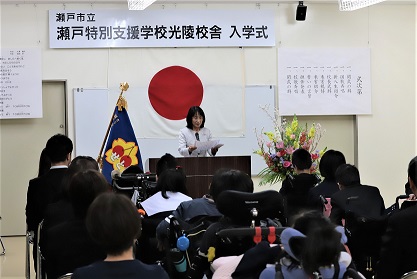 満開の桜に祝福され、瀬戸特別支援学校光陵校舎で中学部7名、高等部5名の生徒を迎え、入学式を行いました。新入生は、「将来の自立や社会生活に向けて、しっかり目標を立て楽しい学校生活を送りましょう。」という校長の話を、しっかりとした態度で聞き入っていました。一人一人が輝き、充実した中学生活、高校生活を送ってくれることと思います。