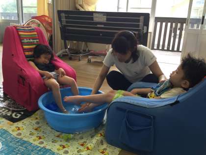1年生の自立活動(たいけん)の授業では、感触遊びをしています。水の入ったボウルにお花紙を入れて、溶けた紙のふわふわやどろどろとした感触を味わいました。また、たらいに水とビー玉やウォータービーズを入れ、足でビー玉のコロコロ転がる感触やウォータービーズのプルプルした感触も味わいました。夢中で足をバタバタさせる子や、感触を受けて笑顔を見せて足を動かす子、友達に水をかけて楽しむ子など、さまざまな表現の仕方で楽しむ様子が見られました。