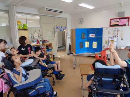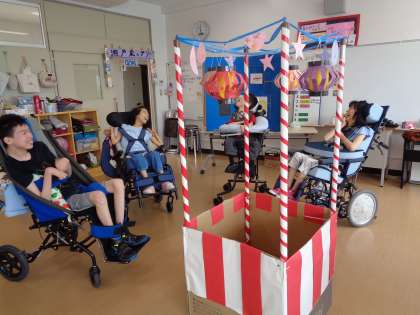 高等部1・2・3年2組 自立活動(体験)「夏祭りをしよう」 公開日 2019/07/18 更新日 2019/07/18 学校日記 6月の終わりから準備を進めてきた、体験の「夏祭りをしよう」。オリジナルで作った「夏祭りのうた」に合わせて一人ずつ太鼓を打ち鳴らし、とてもにぎやかな雰囲気で始まります。 盆踊りでは、みんなで選んだ曲を盆踊りの曲に使うことで、たくさんの笑顔が見られました。ゲーム遊びの射的では、的にみんなで自由に描いた絵を貼ったところ、愛着のわく的になりました! いいね(0)