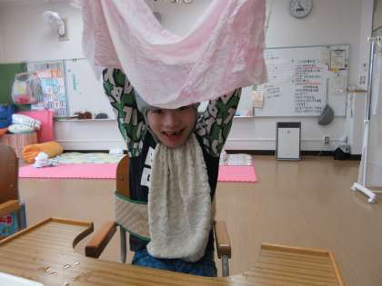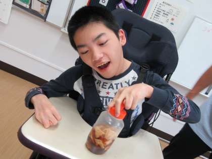 体験「染め物」の活動では、手ぬぐいをコーヒー・紅茶・ブルーベリーなどの自然のもので、しぼり染めをしました。広口ボトルに輪ゴムでしぼった手ぬぐいと染め液を入れることで、自分のボトルを両手で振ったり、眺めたりすることができました。ふんわりとした優しい色合いに染め上がりました。