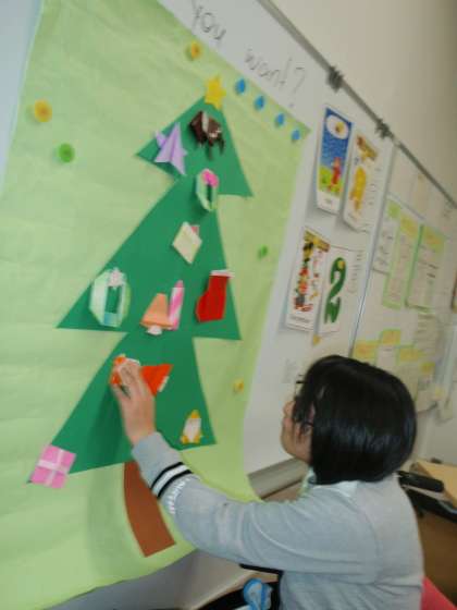 みんなの大好きな英語の授業。今月のテーマは「クリスマス」。絵カードを見て、クリスマスに関する単語を発音したり、クリスマスソングを英語で歌ったりしました。その後は、「What do you want?」の質問に「I want 〜」と答えながら、飾りを選び、クリスマスツリーを完成させました。今年最後のALTさんとの授業、みんなで「よいお年を」「Merry Christmas & Happy new year!」の挨拶で授業をしめくくりました。