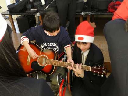 クリスマスソングのミニコンサートの後、一緒にギターを弾かせてもらいました。自分の好きな曲のコードや指使いを教えてもらいながら演奏に挑戦しました。