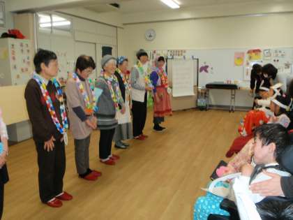 今回も手遊びや寸劇を交えた楽しいお話をいくつもしていただきました。会の終わりには、感謝の気持ちをこめて、児童が作った首飾りを渡しました。