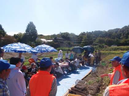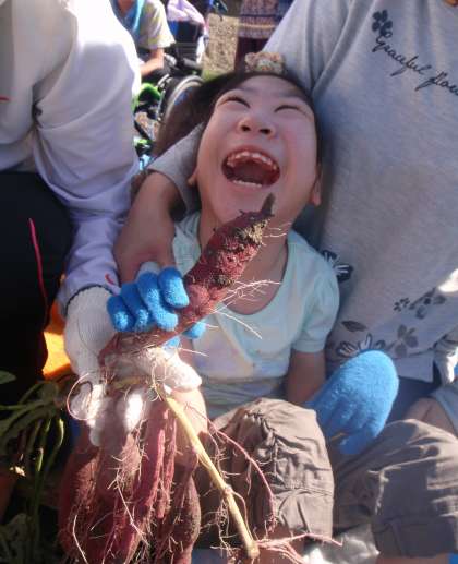 10月8日(水)に小学部4年生と高等部1年2組、2年2組、3年1組の児童生徒が「アクティブシニアネットせと」の方々による芋掘りに参加しました。すっきりと晴れた青空の下、芋のつるを一生懸命に引っ張りました。自分で掘ったさつまいもを目にして、子どもたちは大喜びでした。