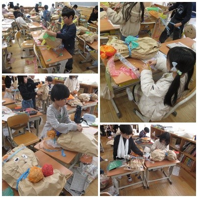 大きな袋に新聞紙などをつめ、くしゃくしゃにしたり、ぎゅっとしぼったりして形を作っていました。