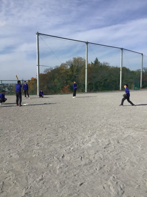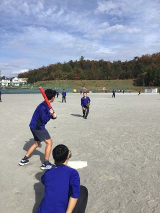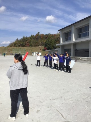 9年生の保健体育では「ソフトボール」を行っています。ルールが難しく、最近では簡易化したゲームを行うことが多いですが、この学年では、ダブルプレーやトリプルプレイなど、ルールを理解して声を掛け合いながら取り組んでいます。