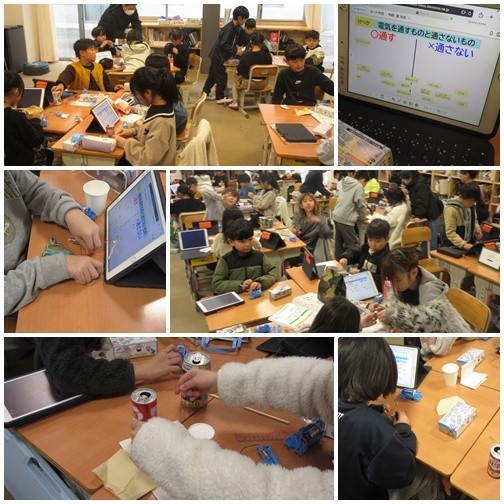 「これは電気が通る」「これはダメ!」などみんな興味津々で様々なものに電気を流していました。