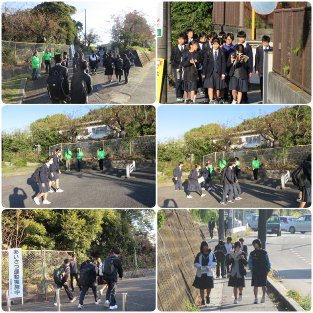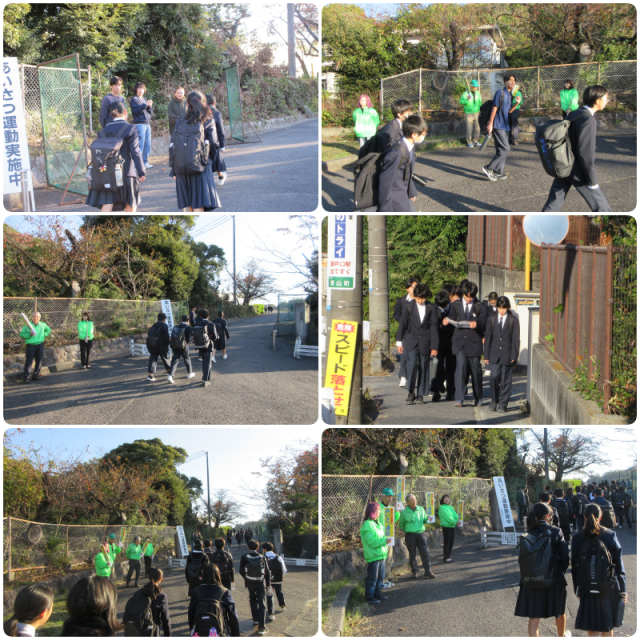 本日、定期テスト初日に合わせて、PTAの皆様と少年センター水無瀬支部の方々に校門や玄関であいさつ運動を行っていただきました。また、PTA会員の皆様には、通学路でもあいさつ運動にご協力いただき、ありがとうございました。