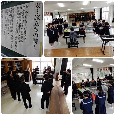 3年生の音楽の授業です。卒業式まで3年生が学校に来る日は、今日を入れて13日です。毎日の1時間がとても大切な時間です。