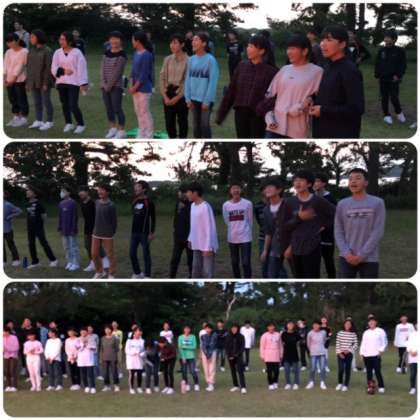 大声大会。2つのグループに分かれて、校歌を大声で歌いました。