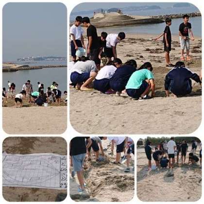 遊漁船体験と平行して、後半3クラスは大浦海岸で、サンドアート作成中です。