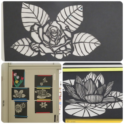 前回の掲載した切り絵に続き、今回は花を題材にした作品が掲示されています。前回掲載の作品は下の緑色の文字をクリックして、ご覧ください。