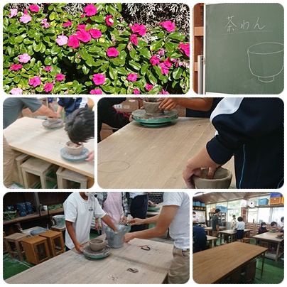 週に1回の割合で、地域の講師の方に、窯業の指導にきていただいています。今日は茶碗作りで、集中してろくろに向かっています。大きさや形などそれぞれの個性をいかして作品作りをしました。