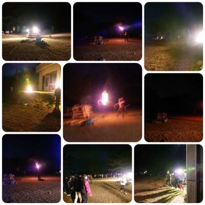 キャンプファイヤー、強風のため、安全を考えて、ライトを点灯しました。