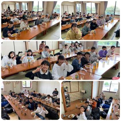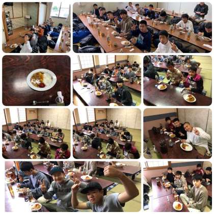 記者王が終わり、各民宿にもどり、昼食を食べています。メニューはカレーライスです。おかわりもしています。