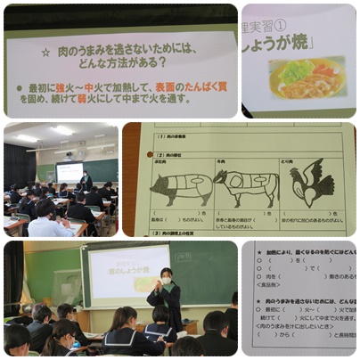 1年生の家庭科では、肉料理について学習しています。具体的には肉の部位や調理方法などを学びました。最終的に、万全な感染防止対策をして、短時間で調理実習ができればと考えています。