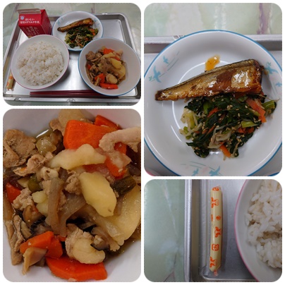 今日の給食は、「麦ごはん 牛乳 さんま梅煮 青菜のおひたし 棒チーズ」でした。