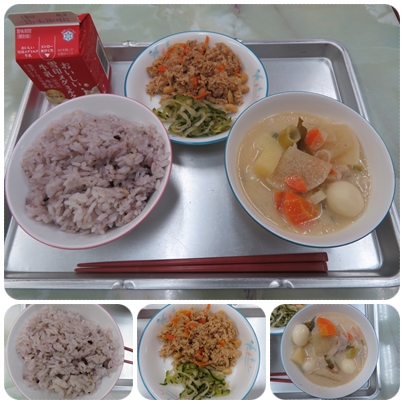 今日の給食は、「五穀ごはん 牛乳 洋風団子汁 ツナのあまからに きゅうりとたくあんのあえもの」です。「ツナのあまからに」は6月の応募料理です。