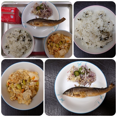 今日の給食のメニューは、「わかめごはん 生揚げの卵とじ あゆの塩焼き 赤じそあえ」でした。